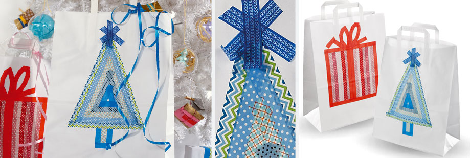 • De plakband afsnijden en naar gelang uw inspiratie op de tas plakken om de gewenste vorm te creëren.
