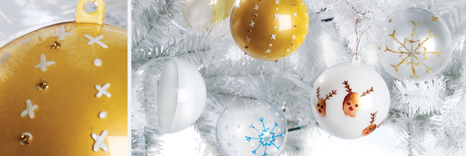 • Sluit de bol en versier de buitenkant met de Diamsou-verf en de Giotto-decoratiestiften, door er sterren, sneeuwvolkjes of rendieren op te tekenen.