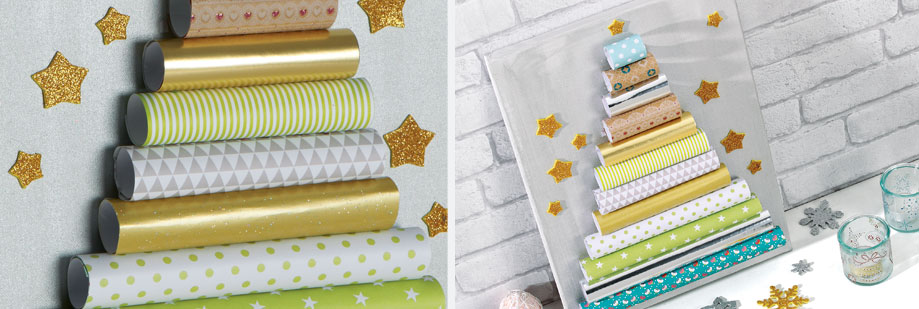 • Als het kader droog is, plak je de opgerolde velletjes er op in de vorm van een kerstboom.
