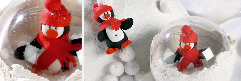Plaats de suiker op de bodem van de halve bol en plaats de pinguïn daarop.