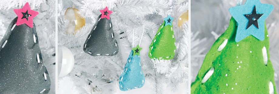 • Knip het stukje van het satijnen koord af en knoop het door de naad van de kerstboom, om een oogje te maken om hem op te hangen.