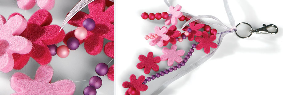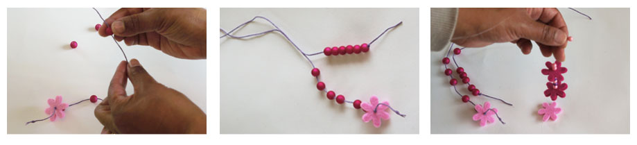 Vervolgens de draad door, afwisselend, parels en vilten bloempjes steken : om door de bloempjes te steken is een naald vereist.