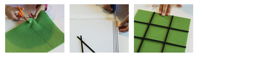 De zwarten banden op het groene vlak plakken, respectievelijk op 6,5 cm en 13 cm afstand van de rand, aan de twee zijden.