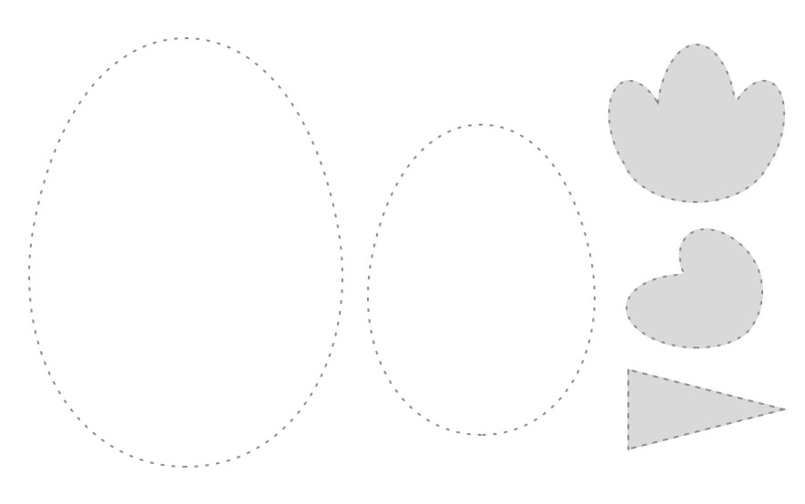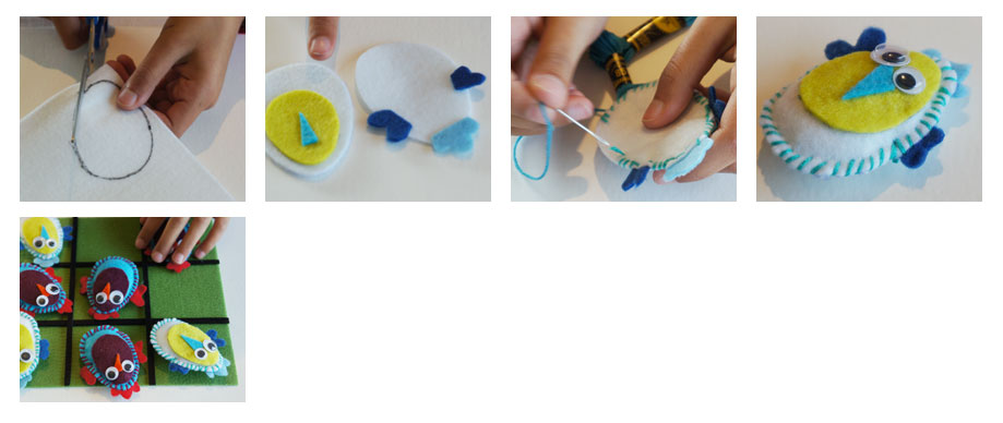De onderdelen als volgt assembleren : de kleine vilten onderdelen op de grotere vormen plakken.