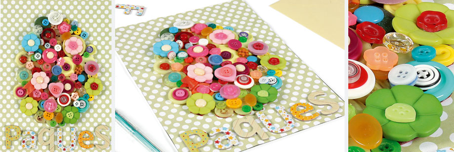 Sorteer de knopen op grootte. Plak eerst de grootste knopen op het ei. Plak vervolgens de kleinere er op en zorg dat ze elkaar aanraken en tegen de grote aanzitten en plak al laatste de kleinste knopen er op.