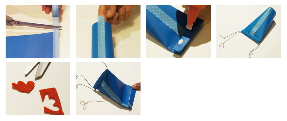 Het bovenste deel van het kokertje omslaan, en er vervolgens de verschillende vilten stukken op plakken.
